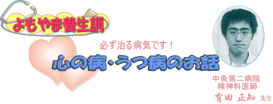 次に休養です。休養をとるにあたり大事な事は「うつ病は必ず治る病気である」と言う事です。ですから焦らず十分な休養をとりましょう。休養のとりかたは千差万別ですが、無理な気分転換や気晴らしは厳禁です。周囲の方もこの点についてはご理解下さい。叱咤激励も逆効果です。必ず治る病気と理解して頂き本人、周囲がゆったり落ち着いている事が大切です。