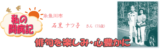 ここ数年足腰が悪いもので、車椅子でもいいと思い、家での生活を望み主人と二人三脚で過ごしております。幸いにも目と口、耳と鼻があります。うれしいことに近くの皆様が訪れ、新鮮な野菜や魚を持って明るいお話をされて行かれます。