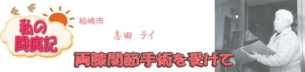 手術3日目にモルヒネが抜かれ、リハビリが始まった。二週間以内に足を曲げる練習をしないと永久に曲がらないといわれ、我慢しようと思ってもつい悲鳴をあげる始末である。9月3日にリハビリ病棟に移り本格的な訓練が始まった。一分毎に陣痛がやってくるような電器機械が、曲げる角度に合わせ2時間も続くのである。でも日毎に痛みも薄れ、90度曲げられる様になると痛さがなくなってきた。歩行器具や車椅子を使用して一人でトイレの使用許可が出たときは何より嬉しかった。
